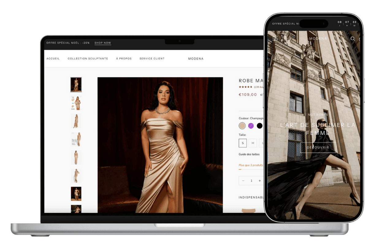 Création d’un site e-commerce Shopify pour une marque de robes, avec une structure claire, un design orienté conversion et une expérience fluide sur mobile et ordinateur.