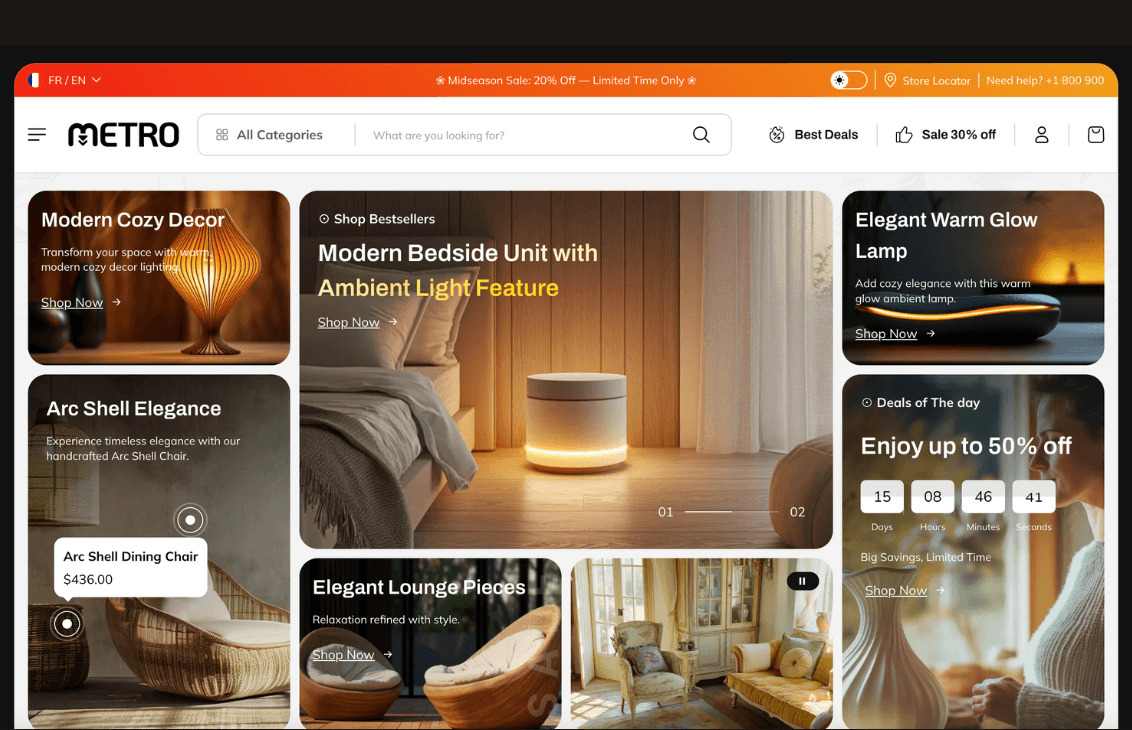 Conception d’un site e-commerce pour une entreprise de mobilier souhaitant passer d’une activité offline à une vente en ligne structurée. Le site a été pensé pour soutenir le développement à l’international et faciliter les commandes à l’étranger.
